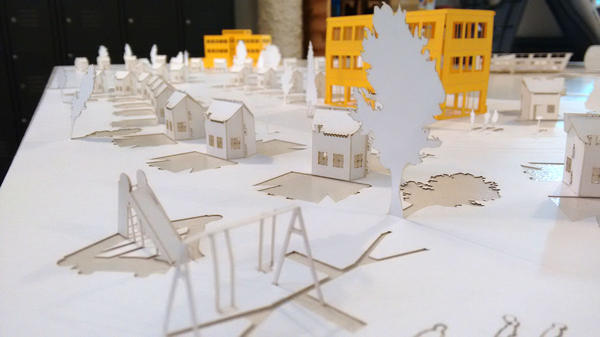 Para este nuevo modelo decidí hacer lo mismo que con los elementos de atrezzo del anterior y cortar cada elemento de la hoja base para luego doblarlo hacia arriba a lo Peter Callesen. Eso me permitiría poner las casas más juntas y crear un paisaje más denso.
